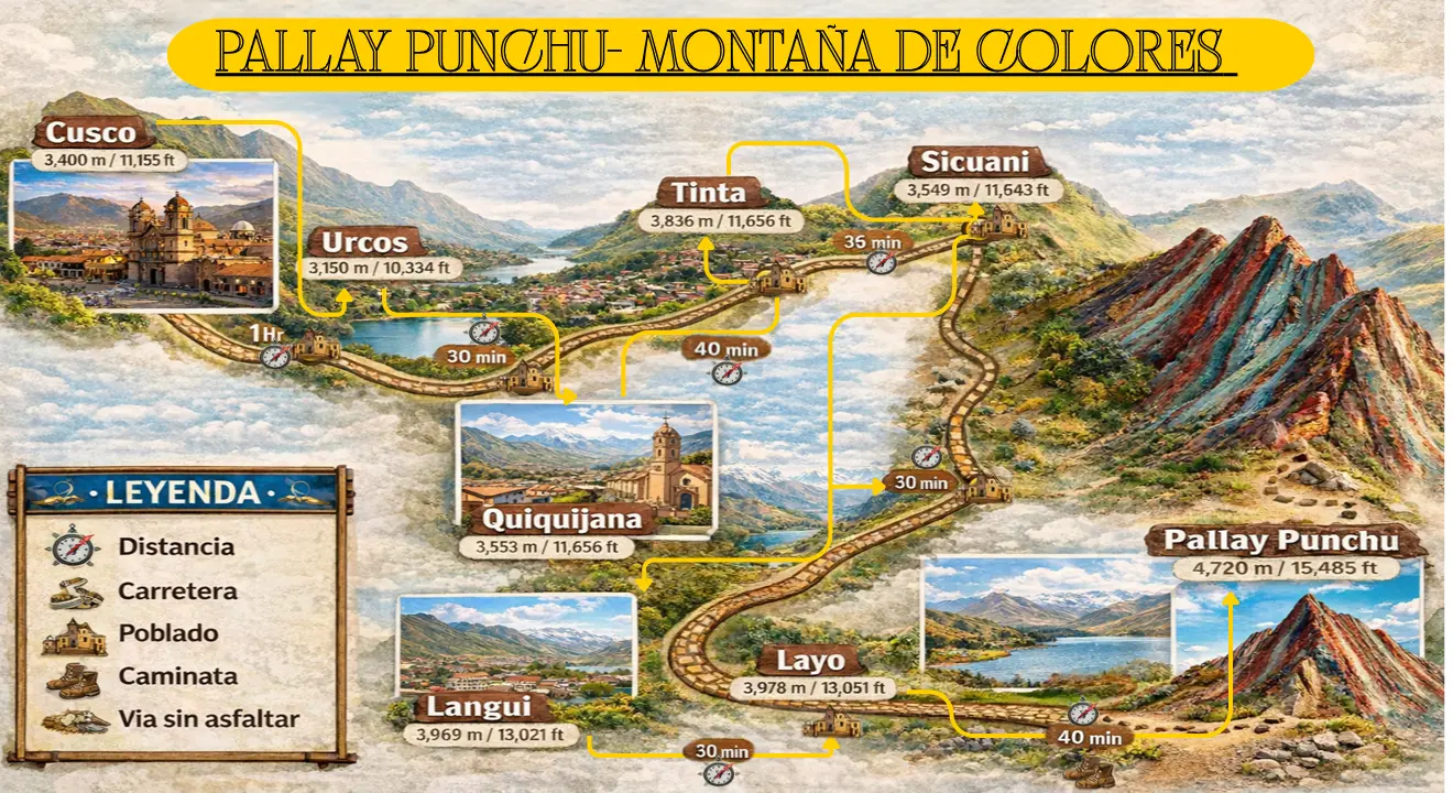 To reach Pallay Punchu, you must first travel from the city of Cusco to the district of Layo, in the province of Canas. The road trip takes approximately 4 to 5 hours, passing through high Andean landscapes, rural communities, and spectacular views of the southern highlands of Cusco.